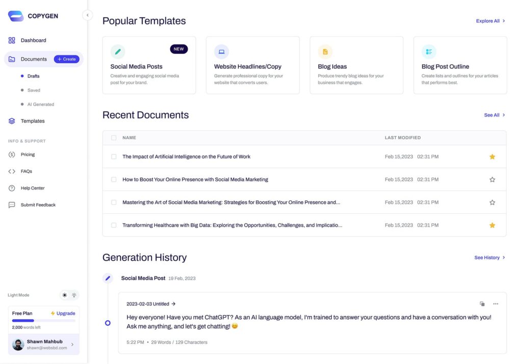 Simply choose a template from available list to write content for blog posts, landing page, website content etc.